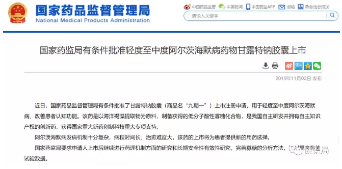 11月2日,国家药监局印发通知称,已有条件批准了甘露特钠胶囊(商品名“九期一”)上市注册申请,用于轻度至中度阿尔茨海默病,改善患者认知功能。