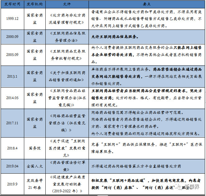 未来,随着政策的逐渐放开,以及一些新兴商业模式的诞生,如“网订店取”和“网订店送”的O2O商业模式,线下和线上药品零售协同合作发展,有望打开院外零售市场新的成长空间。互联网药店的发展空间取决于其是否能承接实体医院处方,以及互联网医疗机构的成熟度,因此互联网技术、远程医疗服务将成为医药零售的重要升级方向。行业发展趋势可以从政策的演变过程中一窥究竟。
