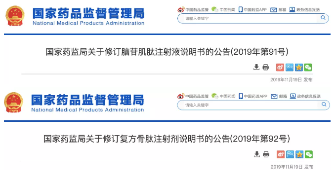 11月19日,国家药监局发布两则公告,分别修订脑苷肌肽注射液、复方骨肽注射剂的药品说明书。