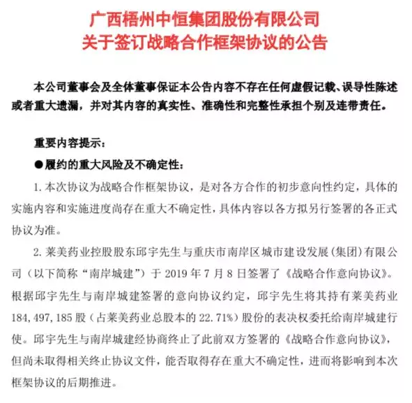 11月24日,中恒集团与莱美药业及其控股股东邱宇建立战略合作伙伴关系。与此同时,莱美药业也宣告与重庆南岸城建正式分手。