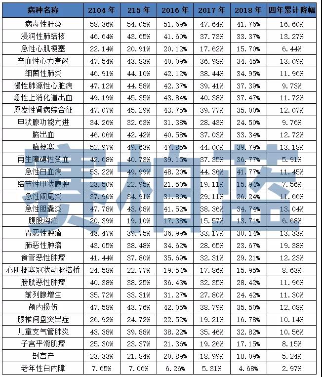 这29个病种中,除剖宫产年均药费在2014-2018年期间略有上升外,绝大多数病种的药费也有不同程度的下降。其中,腰椎间盘突出症和心肌梗塞冠状动脉搭桥药费累计降幅在30%以上,其余大多也在20%以上。