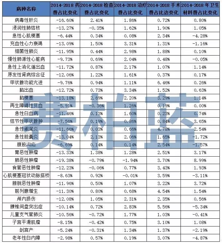 29个病种中,检查费占比有22个出现上升,治疗费占比27个出现上升,手术费占比则全部上升,卫生材料费占比则也有19个出现上升。