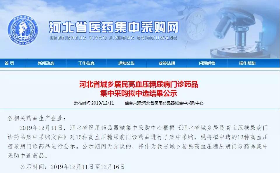 河北省“两病”药品集中采购拟中选结果