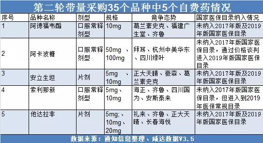 对第二轮带量采购35个试点品种情况进行分析,其中有5个品种为未纳入到2017年国家医保目录的自费药。而这5个品种中,索利那新在2019年国家医保常规目录调整时已经被纳入,阿卡波糖则通过药价谈判最终也进入到2019年国家医保目录中,其余三个品种阿德福韦酯、安立生坦及他达拉非则未纳入到两版本的国家医保目录之中。