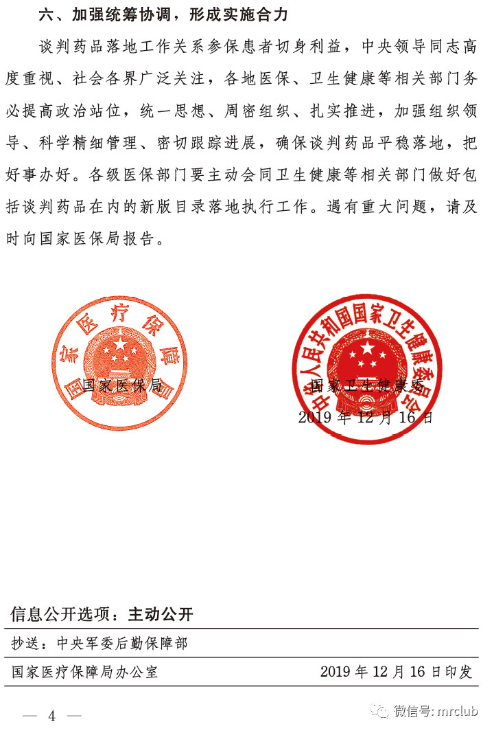 据 MRCLUB 网友反馈,12月16日,国家医保局、国家卫生健康委已经联合下发《关于做好 2019 年国家医保谈判药品落地工作的通知》(后附扫描版),要求各省级医保部门按照规定的时限将 97 个谈判药品在省级药品集中采购平台上直接挂网,同时,要保证新版目录及时落地。