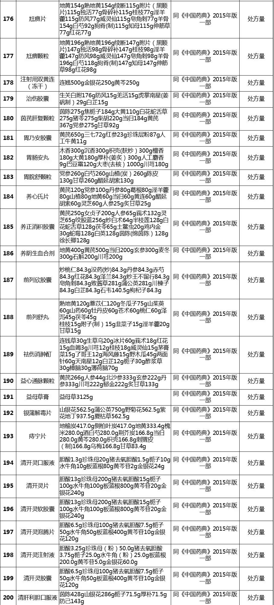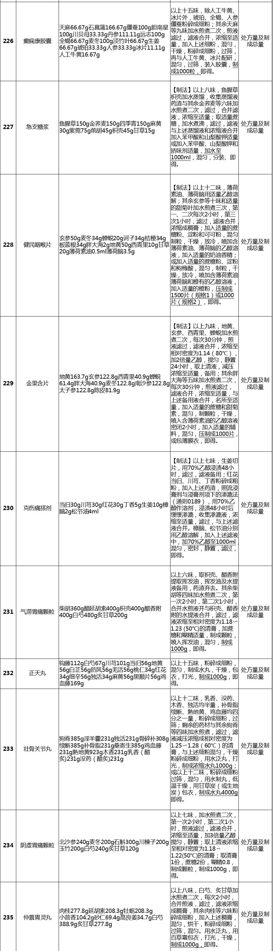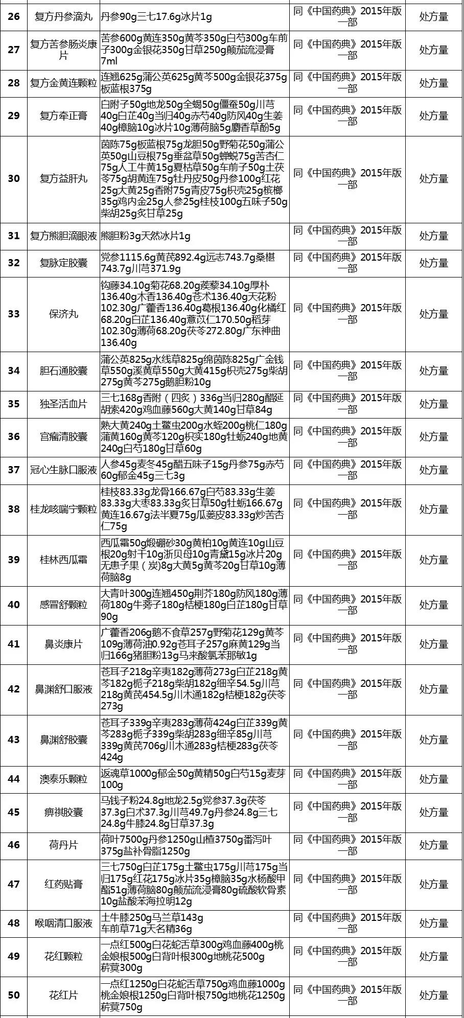 经梳理,该表共涉及255个中成药品种,除5个品种在2020版《中国药典》修订时已单独进行公示、2015年版《中国药典》【制法】中已包含处方量或不需要补充处方量外,其余250个品种均有新公开的处方量或制法的相关信息。