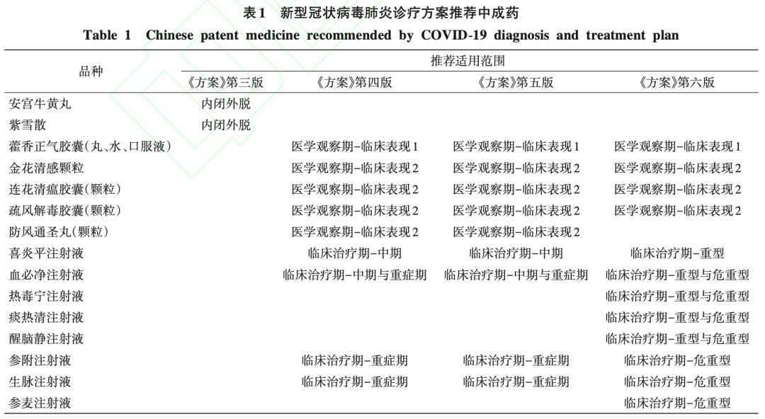 来源:杨晨、袁力、刘翠英、施金虎、王萍、罗茂华,基于《新型冠状病毒肺炎诊疗方案》的中成药合理使用与药学监护,暨南大学学报(自然科学与医学版)