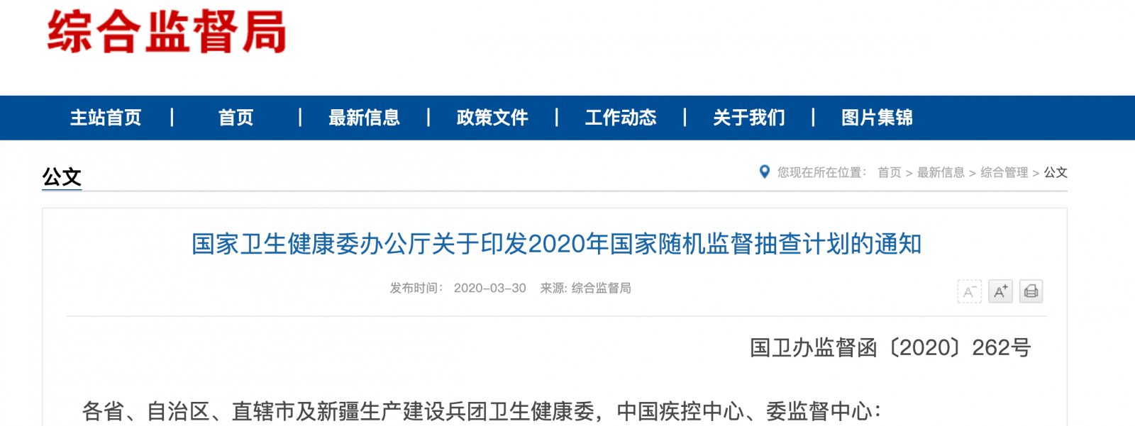 国家卫健委发布《国家卫生健康委办公厅关于印发2020年国家随机监督抽查计划的通知》(以下简称《通知》)。2020年国家随机监督抽查计划行动启动了。