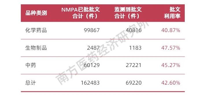 南方所在2016年通过医院终端监测系统[HDM]和零售终端监测系统[RDM]全品种批文比对分析显示:共监测到在销药品品种11946个,占总药品品种数量的71.37%;共监测到在销批准文号69220个,占批准文号总量(162483件)的42.60%,可以看出批准文号的总体利用率较低,也同时意味着有近一半的药品批文处于“睡眠”状态,没有实质有经济利益,对这些品种的批文再注册费用也会损耗生产企业的利润来源。