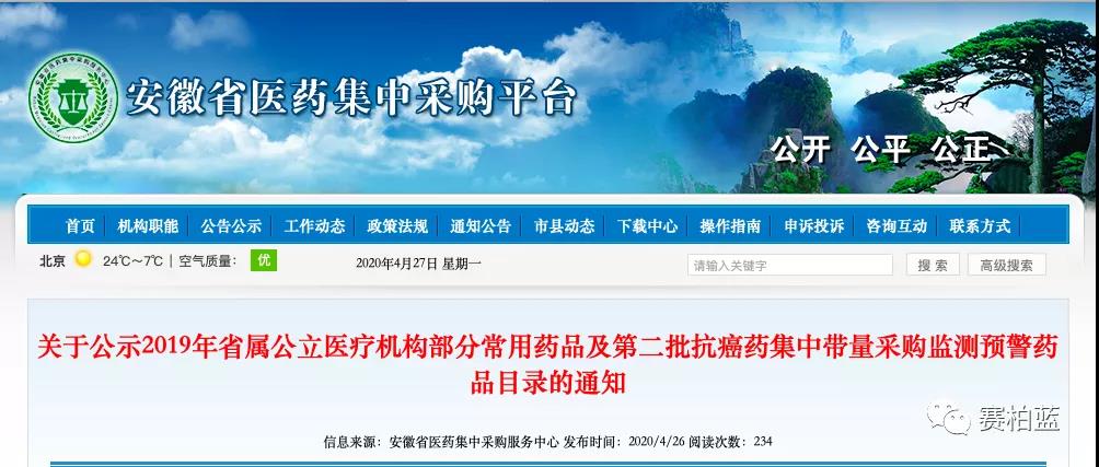 26日,安徽医药集采服务中心发布《关于公示2019年省属公立医疗机构部分常用药品及第二批抗癌药集中带量采购监测预警药品目录的通知》。