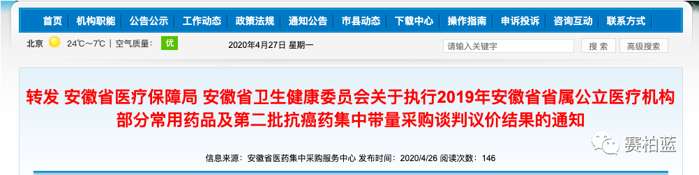 据赛柏蓝查询,这一规定源于去年12月4日安徽医保局等多部门发布的《2019年安徽省省属公立医疗机构部分常用药品及第二批抗癌药集中带量采购谈判议价(试点)实施方案》。